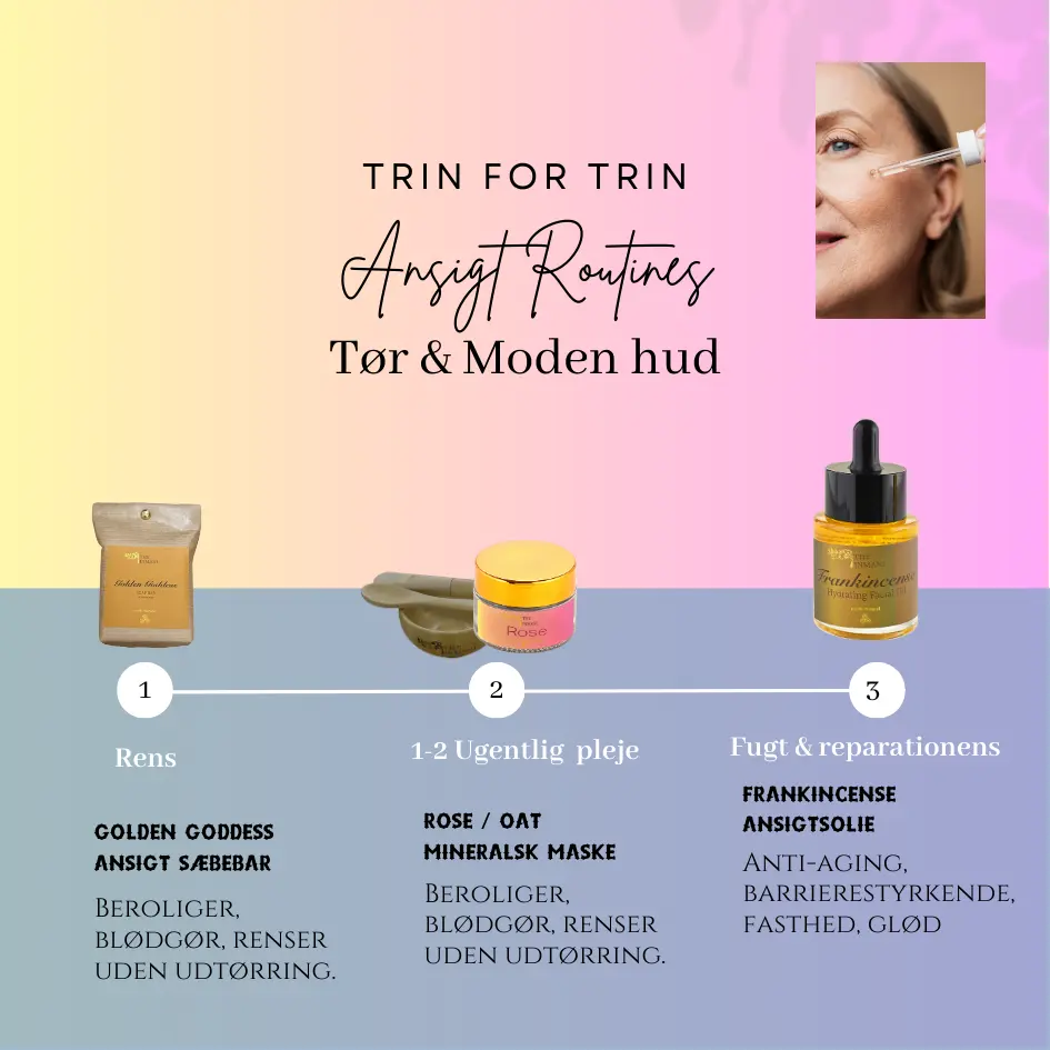 3-trins hudplejekit til tør og moden hud. Skånsom rens, nærende olie og mineralsk maske, der arbejder sammen for fugt, glød og mere spændstighed.